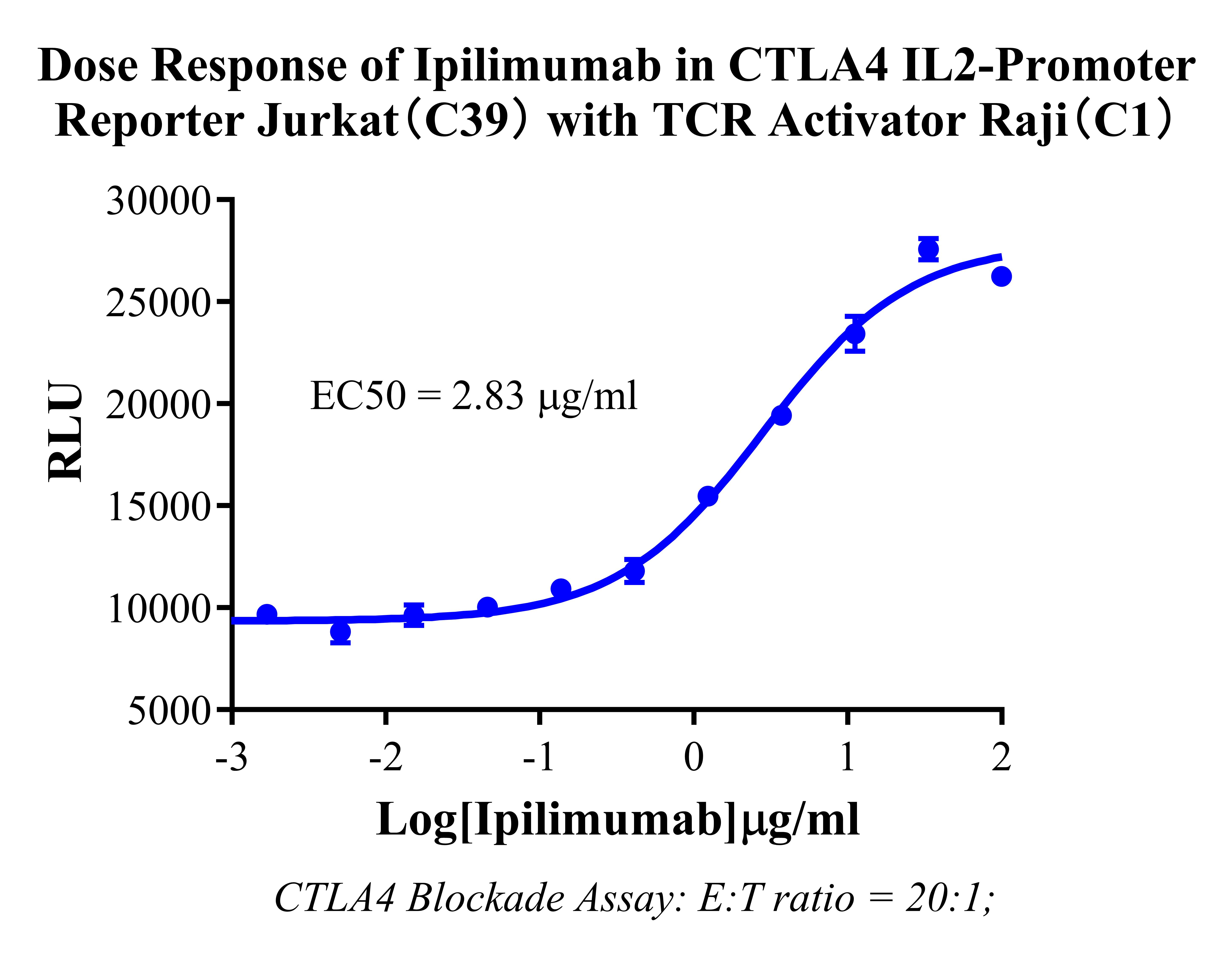 Figure 5. Dose Response of lpilimumab in CTLA4 IL-2 Promoter Reporter-Jurkat (C39)with TCR Activitor Raji (C1).