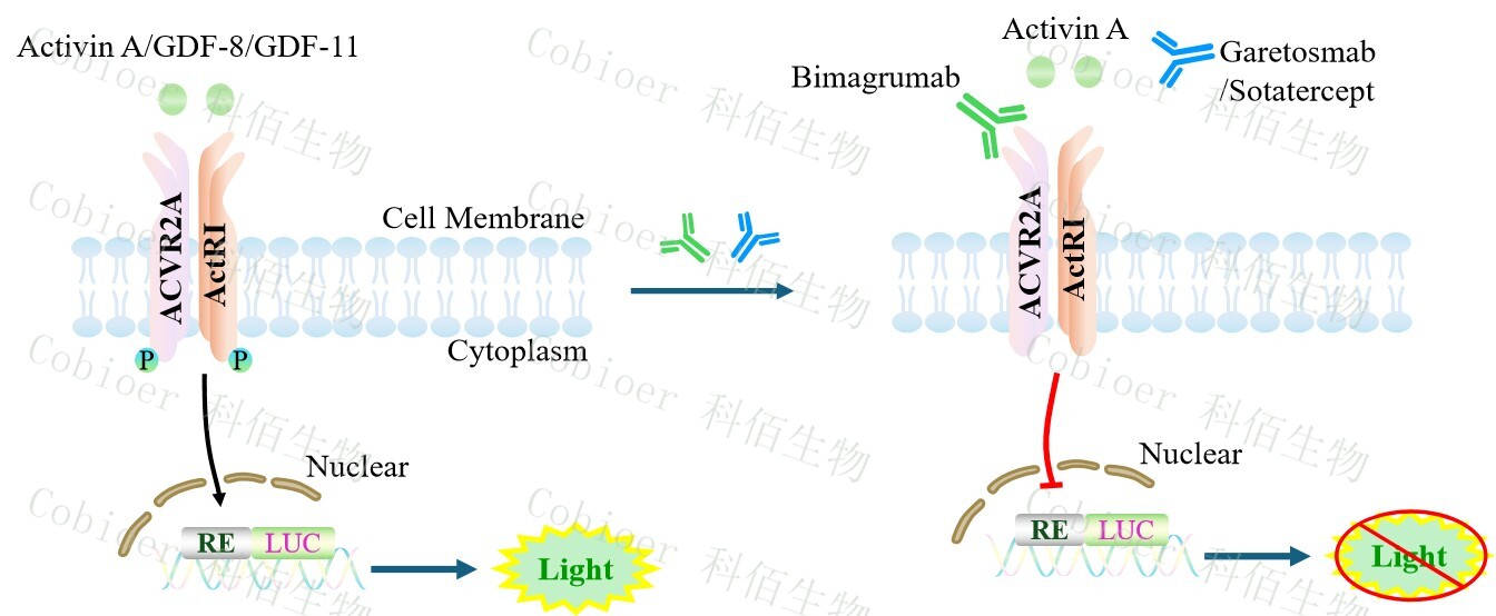 ACVR2A Effector Reporter Cell 報(bào)告基因藥靶模型很好的模擬了體內(nèi) ACVR2A 的信號 轉(zhuǎn)導(dǎo)過程,原理見下圖所示。