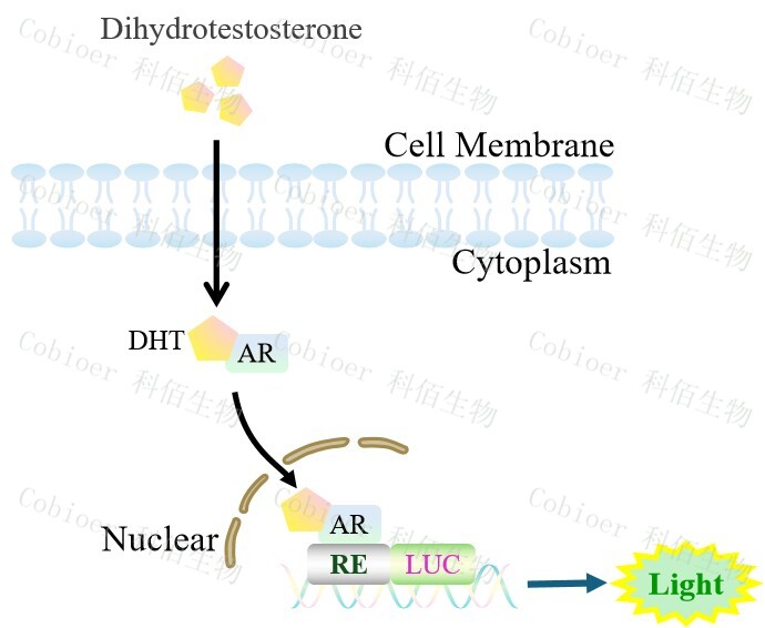 AR Reporter LNCAP Cell(DHT high sensitive)藥靶細(xì)胞,在由調(diào)控因子調(diào) 控并表達(dá)報(bào)告基因的重組細(xì)胞上,穩(wěn)定表達(dá)人 AR。雄激素的代謝產(chǎn)物 DHT(雙氫睪酮) 會(huì)與細(xì)胞上的 AR 結(jié)合,激活 AR 信號(hào)通路,原理見下圖所示。