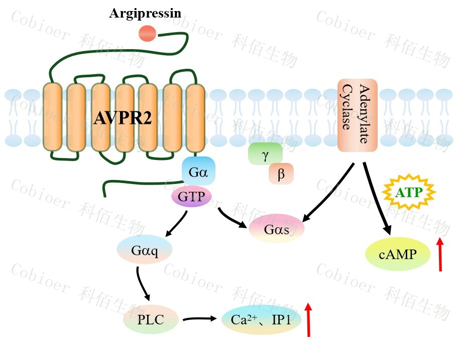 AVPR2(精氨酸加壓素受體 2 型)是一種主要分布于腎臟集合管上皮細(xì)胞基底側(cè)的 G 蛋白偶聯(lián)受體(GPCR),屬于加壓素/催產(chǎn)素受體家族,其特異性配體為垂體后葉分泌的 精氨酸加壓素(AVP,又稱抗利尿激素 ADH);該受體通過偶聯(lián) Gs 蛋白,激活腺苷酸環(huán) 化酶,升高 cAMP,激活蛋白激酶 A(PKA),最終磷酸化并促使水通道蛋白 AQP2 向細(xì) 胞膜轉(zhuǎn)位,從而增加水的重吸收、濃縮尿液并維持體液平衡;其功能缺陷是 X 連鎖隱性遺 傳性腎性尿崩癥(NDI) 的主要病因(占 90%),患者因基因突變導(dǎo)致受體失活,表現(xiàn)為 多尿、煩渴及低滲尿,而獲得性異常則與鋰中毒或梗阻性腎病相關(guān);此外,AVPR2 作為藥 物靶點(diǎn),其拮抗劑(如托伐普坦)已用于治療低鈉血癥和心力衰竭的體液潴留。