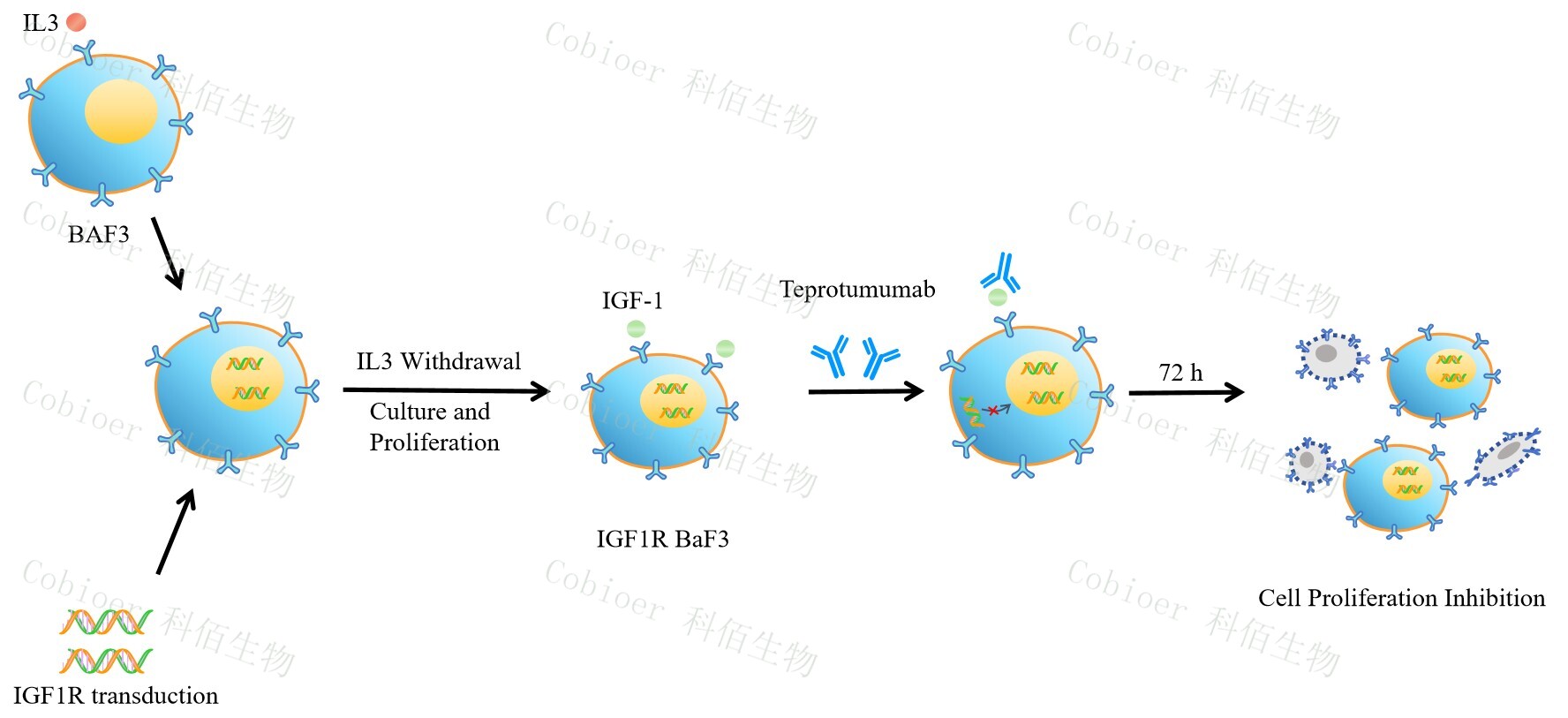BaF3(小鼠原 B 細(xì)胞)的生長(zhǎng)和增殖需要 IL-3 的維持。通過引入各種表達(dá)激酶的基因, 能作為 BaF3 的驅(qū)動(dòng)基因,讓 BaF3 不再依賴 IL-3 而增殖,進(jìn)而激酶基因成為 BaF3 增殖依 賴的驅(qū)動(dòng)基因,用于評(píng)估小分子藥物對(duì)激酶的靶向抑制作用,原理及流程見下圖所示。![]() Figure 1. IGF1R BaF3 細(xì)胞模型原理圖 |