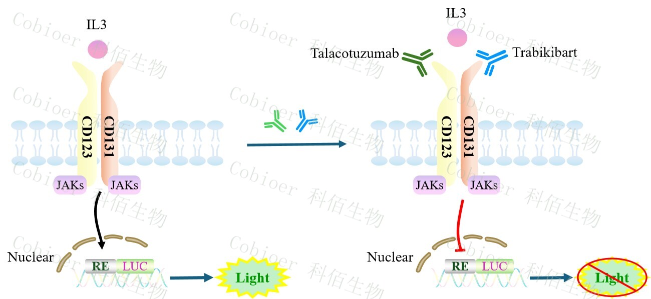 IL3 Effector Reporter Cell 報(bào)告基因藥靶模型很好的模擬了體內(nèi) IL3 的信號轉(zhuǎn)導(dǎo)過程,原理見下圖所示。![]() Figure 1. IL3 Effector Reporter Cell 細(xì)胞模型原理圖 |