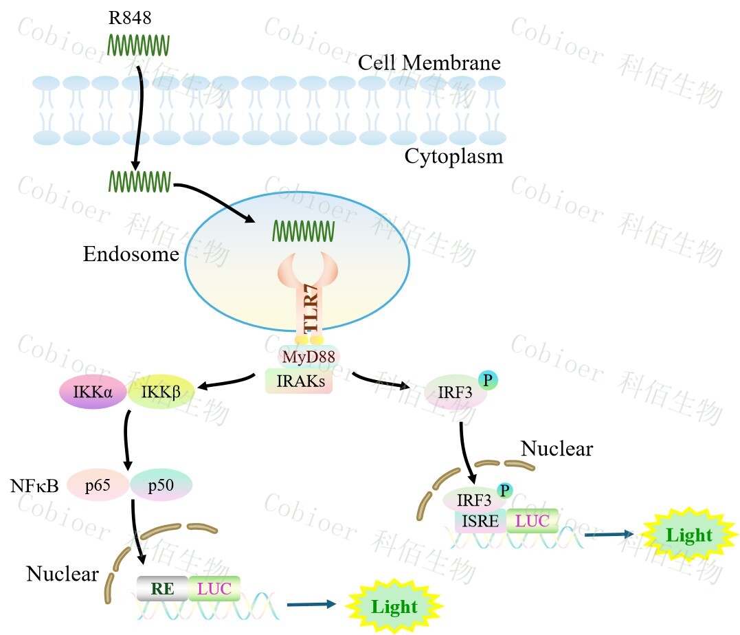 TLR7 NFκB&ISRE Dual Reporter Cell 報(bào)告基因藥靶模型很好的模擬了體內(nèi) TLR7 的信號轉(zhuǎn)導(dǎo)過程,原理見下圖所示。![]() Figure 1. TLR7 NFκB&ISRE Dual Reporter Cell 細(xì)胞模型原理圖 |