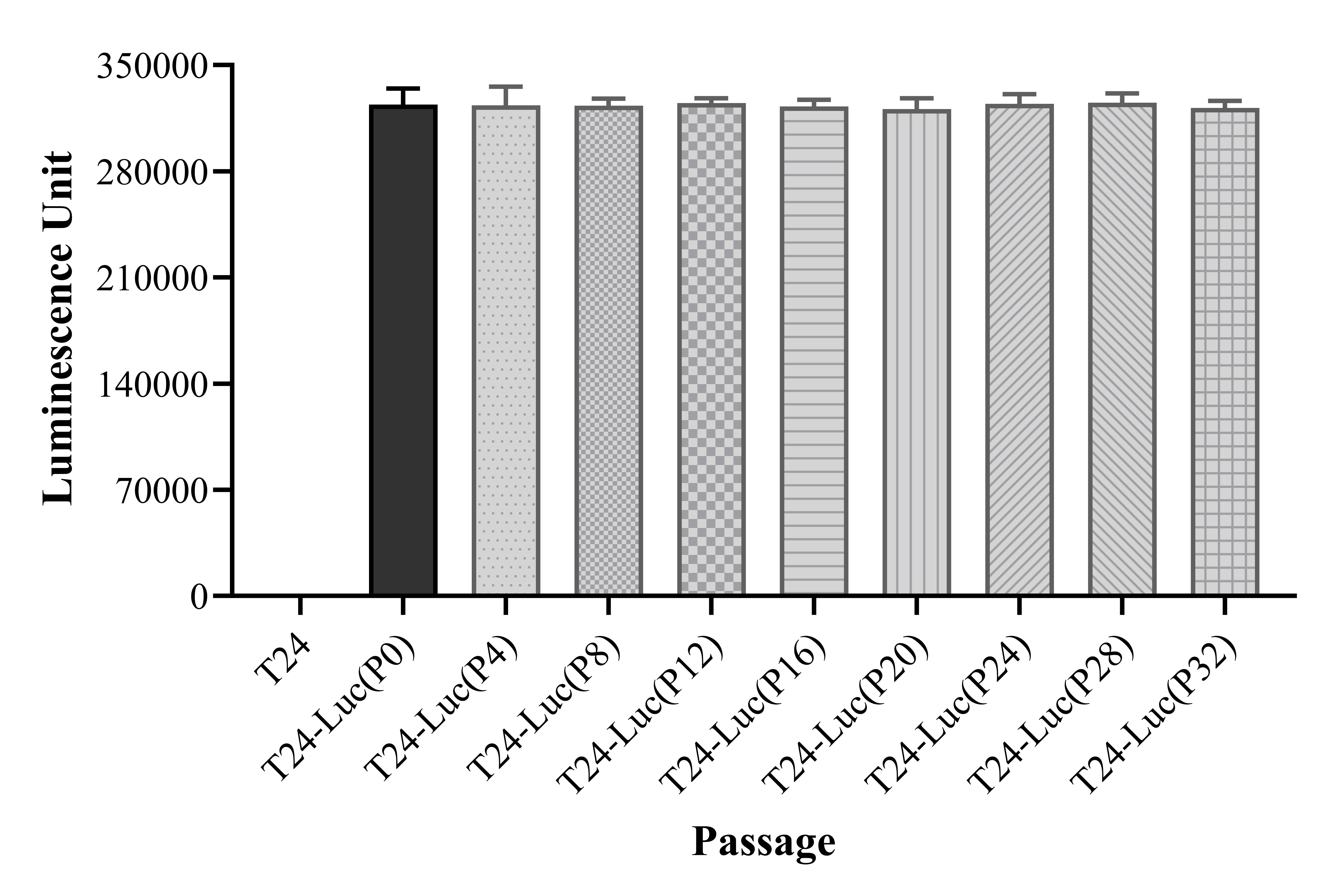 | Figure 1. Stablity test results. T24-Luc showed at least 32 passage stability with similar luminescence unit. | |