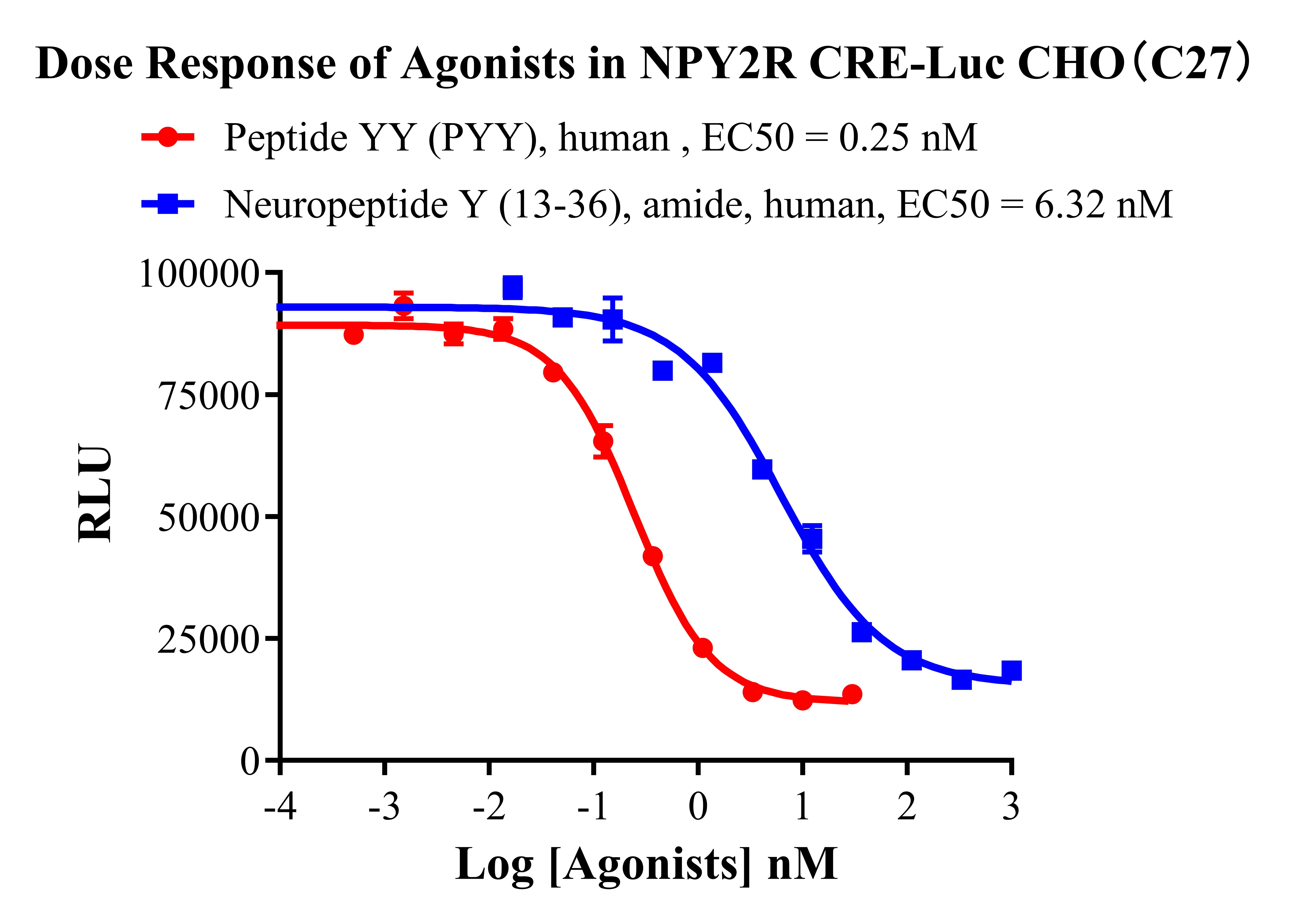 V. Representative Data![]() Recombinant NPY2R CRE-Luc CHO stably expressing NPY2R. ![]() Figure 3. Dose Response of Agonists in NPY2R CRE-Luc CHO(C27). Figure 2. |