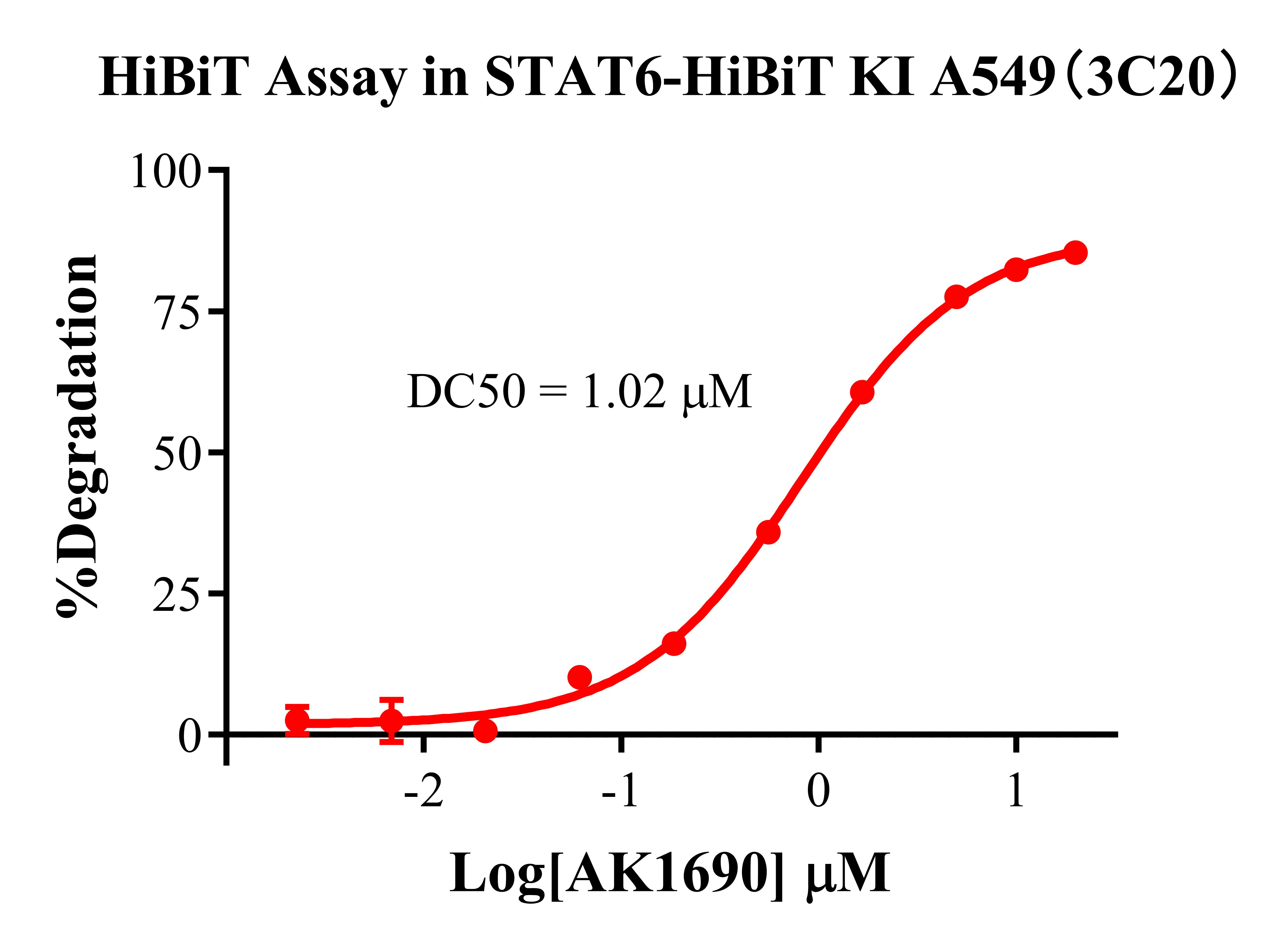 STAT6-HiBiT KI A549 報(bào)告基因細(xì)胞,通過(guò)基因編輯方式將 HiBiT 標(biāo)簽 插入細(xì)胞內(nèi)源的 STAT6 基因中。AK-1690 是一種有效和選擇性的 STAT6 PROTAC 降解劑, 原理見(jiàn)下圖所示。