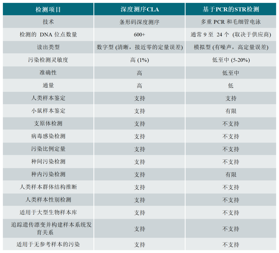 下表比較了用于細胞系認證的深度測序CLA和基于PCR的STR檢測: